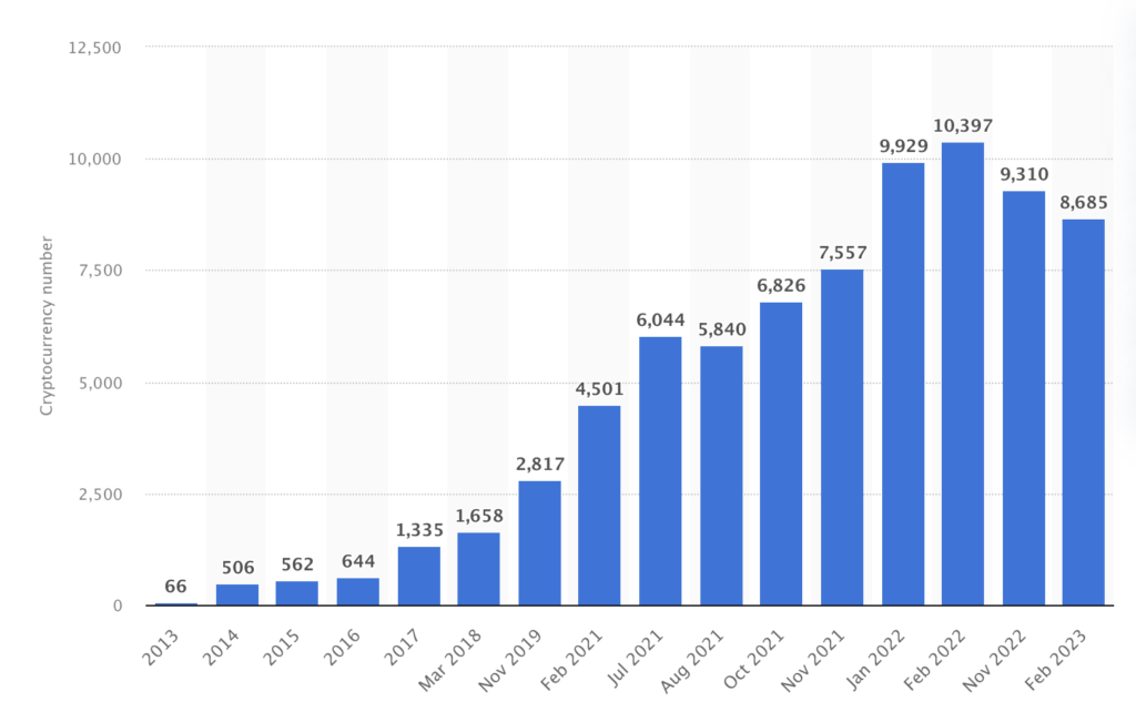 In order to answer this question, we first need to think about another question you may have already asked yourself, namely, “How many cryptocurrencies are there?.” Well, a study published by Statista shows that there are nearly over 8,500 as of February 2023 – a severe increase from just a handful of digital coins in 2013. Indeed, the top 20 cryptocurrencies are believed to make up almost 90 percent of the total market.